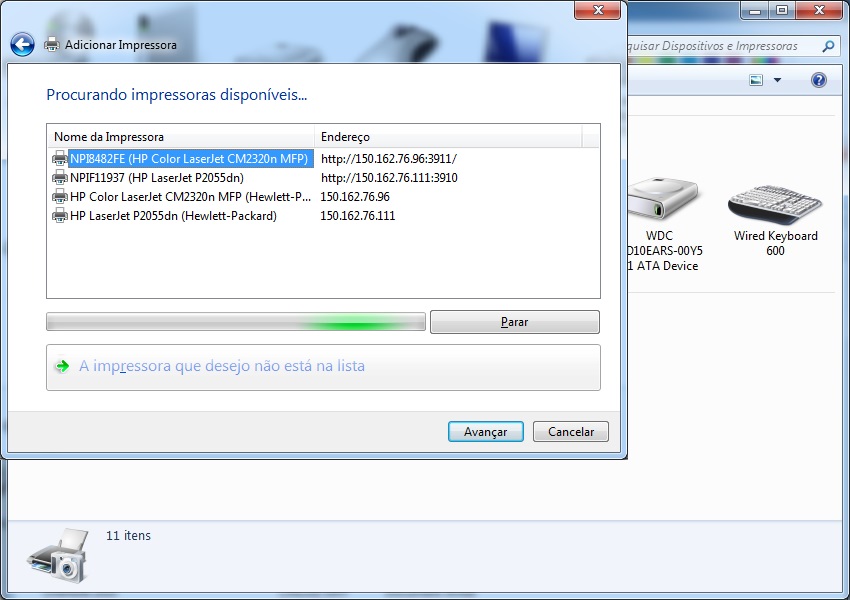 Clicar no botão "adicionar uma impressora de rede..."