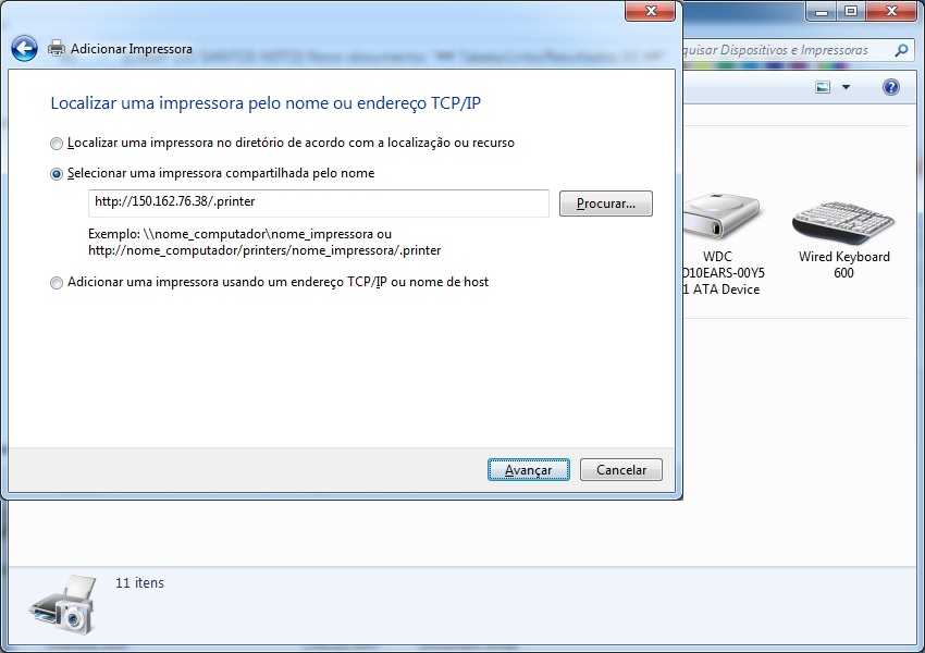 Clicar em "selecionar uma impressora compartilhada pelo nome", e preencher o campo com "http://150.162.76.38/.printer" conforme a imagem.